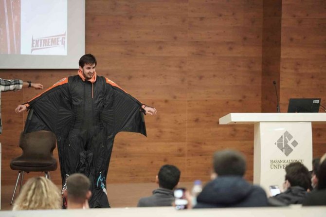 Gökyüzünü yamaç paraşütü ile keşfetmenin detaylarının anlatıldığı söyleşide öğrenciler Wingsuit kıyafetini giyerek deneyimledi. HKÜ Hukuk Amfi'de Makine Mühendisliği Bölümü tarafından düzenlenen söyleşiye; HKÜ Rektör Yardımcısı Prof. Dr. Özge Hacıfazlıoğlu, HKÜ Makine Mühendisliği Bölüm Başkanı Prof. Dr. İbrahim Halil Güzelbey, Yamaç Paraşütçüsü Barış Çelik Doğa, Wingsuit Şahin Şahin, Wingsult Özge Şahin Yazıcı ile akademisyenler ve öğrenciler katıldı.