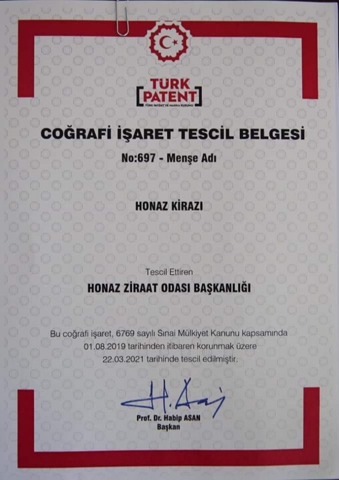 Denizli'de, Honaz Ziraat Odası tarafından 2019 yılında tescil başvurusu yapılan "Honaz kirazı', yapılan denetlemelerin ardından Coğrafi İşaret Belgesi...