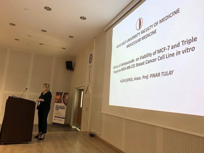 Yakın Doğu Üniversitesi Sağlık Bilimleri Enstitüsü Moleküler Tıp yüksek lisans öğrencisi Hülya Şenol, danışmanları Tıp Fakültesi Dekanı Prof. Dr. Gamze Mocan ve Tıbbi Genetik Anabilim Dalı öğretim üyesi ve DESAM araştırıcısı Doç. Dr. Pınar Tülay ile birlikte yürüttüğü tez çalışmasının bir bölümü olan “MCF-7 Ve Üçlü Negatif Mda-Mb-231 Meme Kanseri Hücre Hatlarında İn Vitro Olarak Verbascosid Molekülünün Etkisinin Uygulanabilirliği” isimli sunumu gerçekleştirdi. Hasan Akyıl da danışmanları Prof. Dr. Gamze Mocan ve Doç. Dr. Mahmut Çerkez Ergören ile birlikte projelendirdiği “Meme Kanseri Hücre Hatlarında Asperulosid’in Tedavi Amaçlı Potansiyel Kullanımı” isimli sunumu yaptı.