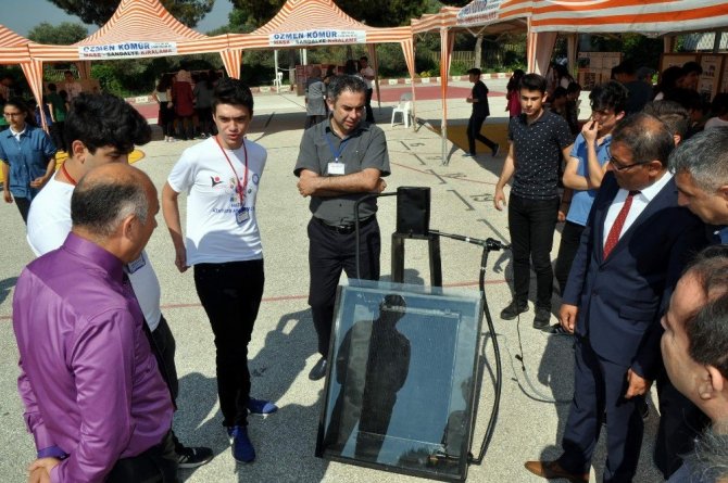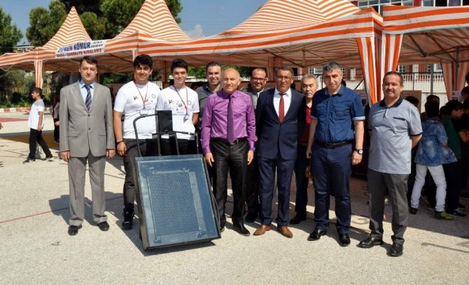 Fuarda sergilenen hurda malzemelerden elde edilen sistemle güneş enerjisi kullanarak ısıtmada kullanılan kaloriferlerde kömür yerine bu sistemden elde edilen sıcak suyun takviye olarak kullanılmasını amaçlayan proje büyük ilgi gördü. Proje Danışmanı Fizik Öğretmeni Murat Özbellek, projeyi hazırlayan öğrenciler Oğulcan Saymaz ve Yaşar Dıra ile birlikte davetlilere sunum yaptılar. Fizik Öğretmeni Murat Özbellek, proje ile ilgili yaptığı açıklamada, “Projenin amacı, Güneş Enerjisinden sıcak su elde edip, kalorifer benzeri gibi yerlerdeki sıcak su ihtiyacını gidermek. Daha bir çevreci enerji elde etmek adına hurda araba radyatörü kullandık. Kullandığımız malzemeler hep geri dönüşüm malzemeleridir. Hurdacılardan topladığımız malzemeleri öğrencilerimiz elden geçirerek proje ekipmanlarını hazırladı. Elde ettiğimiz enerjisini güneşten alan sistemle sıcak suya takviye olarak kullanabileceğimiz bir proje geliştirmiş olduk. Kaloriferlerde kömür yerine ucuz maliyetli bu sistemden elde edilen sıcak su kullanılabilir” dedi.