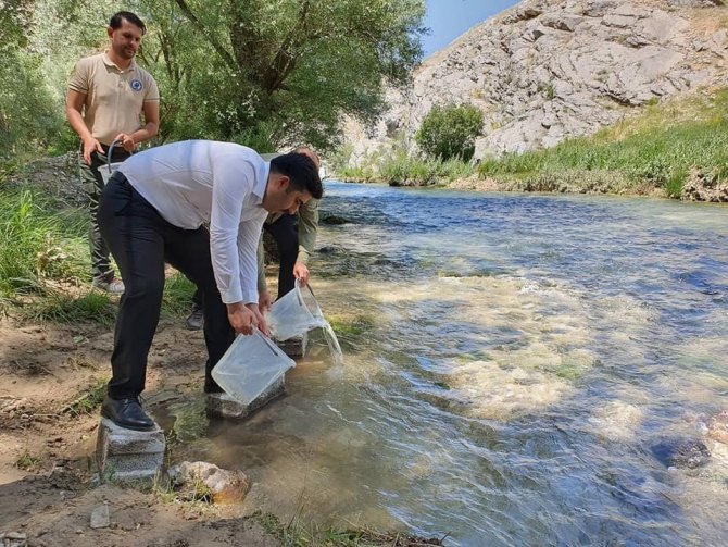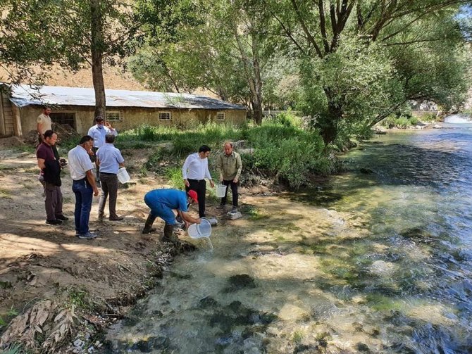 Sivas'ın Gürün ilçesine bağlı Akdere köyünde, Hurman Çayı'na 10 bin 500 kırmızı benekli alabalık yavrusu bırakıldı.