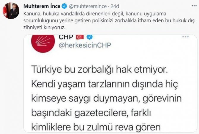 Bu paylaşıma cevap veren İçişleri Bakan Yardımcısı İnce, "Kanuna, hukuka vandallıkla direnenleri değil, kanunu uygulama sorumluluğunu yerine getiren polisimizi zorbalıkla itham eden bu hukuk dışı zihniyeti kınıyoruz" ifadelerini kullandı.