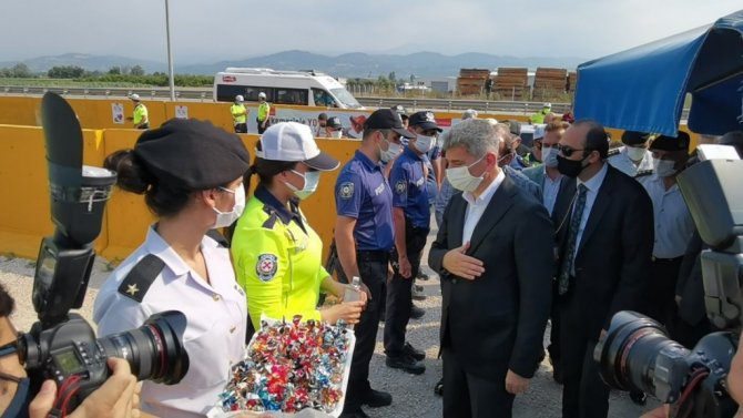 İçişleri Bakan Yardımcısı Muhterem İnce, Bursa'nın İnegöl ilçesinde denetim yaptı. İnce, sürücülere ve yolculara çeşitli hediyeler verdi. Bakan Yardımcısı İnce, "120 bin 372 ekip görevlendirdik" dedi.