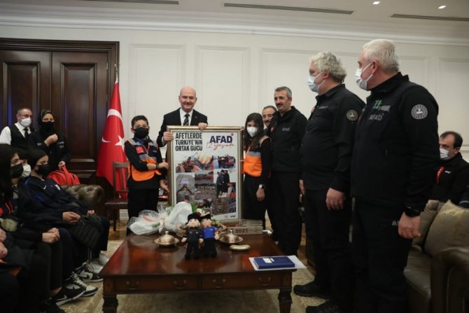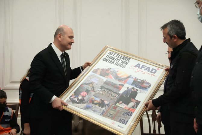 Bakan Soylu'ya konuşmasının ardından tablo hediye eden AFAD yetkilileri, ardından günün anısına Soylu ile hatıra fotoğrafı çekildi.