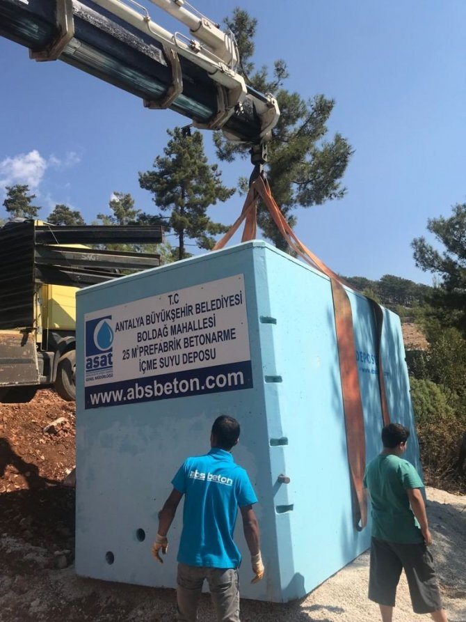 Finike İlçesi Boldağ Mahallesi'nin su sorunu için de prefabrik betonarme içme suyu deposu kullanıldı. ASAT Genel Müdürlüğü ekipleri temin edilen portatif depoyu bölgeye nakletti. Gerekli bağlantıların yapılmasının ardından depo kullanıma sunulacak. Uygun olan yerlerde kullanılmaya başlayan yeni portatif depolar ile içme suyu ihtiyacı hızlı ve pratik şekilde gideriliyor. Nakil ve inşaat giderleri ile imalat süreleri de hesaba katıldığında prefabrik betonarme depoların kullanımı yarar sağlıyor.
