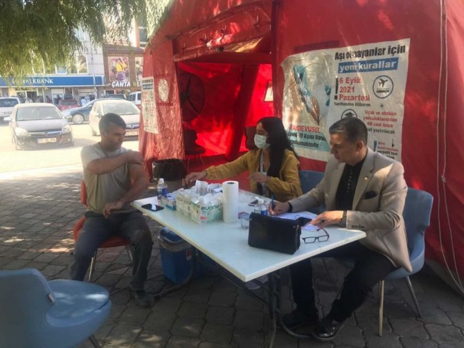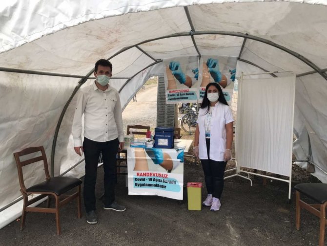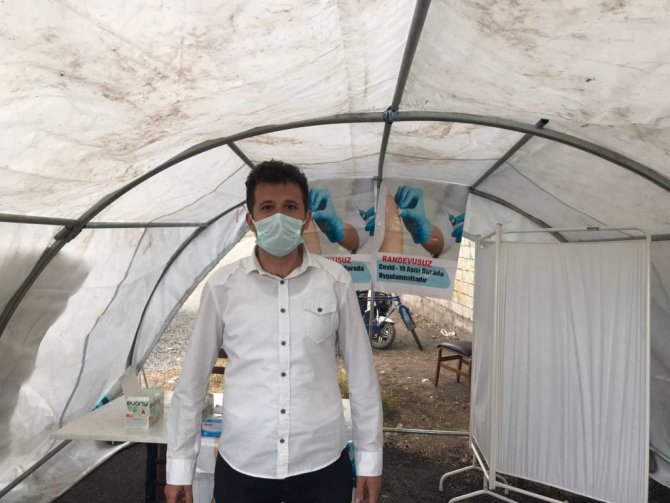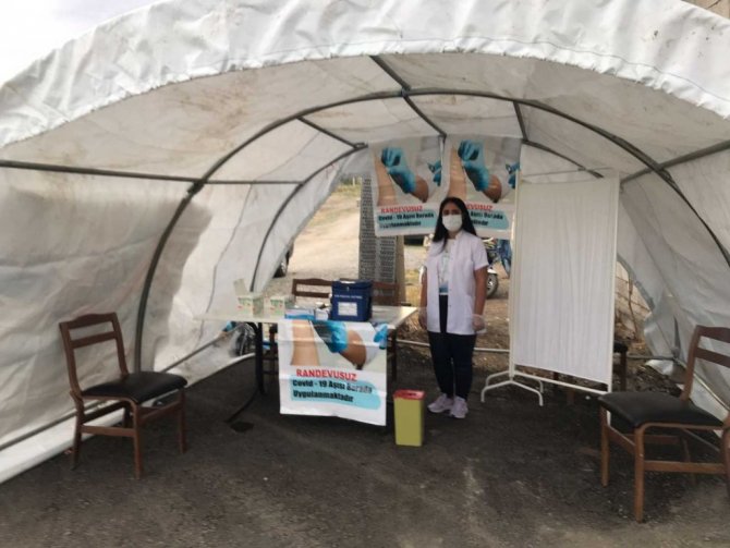 Iğdır'da farklı yerlerde kurulan aşı çadırlarında vatandaşların aşıları, sağlık çalışanları tarafından yapılıyor.