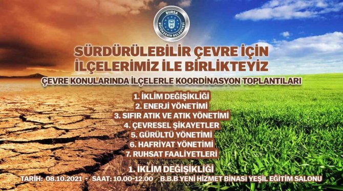 Büyükşehir Belediyesi Çevre Koruma ve Kontrol Dairesi Başkanlığı, iklim değişikliğiyle mücadele çalışmalarının il geneline yayılması ve bu konuda tüm belediyelerin işbirliği içinde olması hedefiyle koordinasyon toplantılarına başladı. Büyükşehir Belediyesi'nin koordinasyonunda yapılan ve ilçe belediyelerinin temsilcilerinin katıldığı ilk toplantıda iklim değişikliği konusu ele alındı. Periyodik olarak yapılacak ve İklim Değişikliği, Enerji Yönetimi, Sıfır Atık ve Atık Yönetimi, Çevresel Şikayetler, Gürültü Yönetimi, Hafriyat Yönetimi, Ruhsat Faaliyetleri gibi konuların ele alınacağı toplantıların ikinci oturumunda "Enerji Yönetimi" konusu ele alınacak.