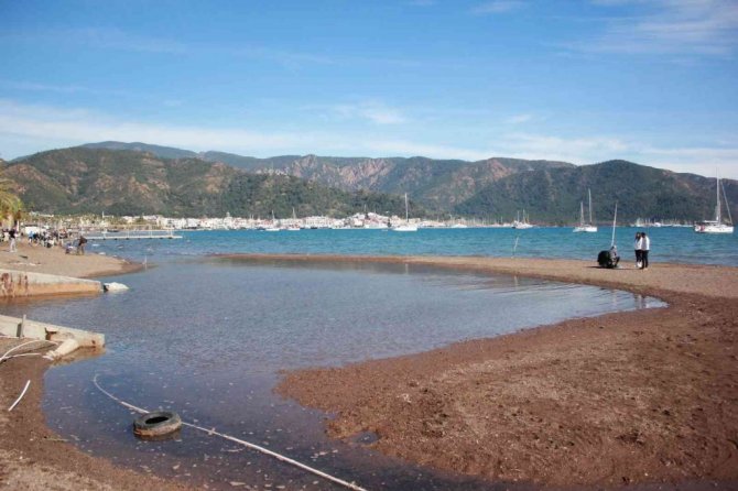 Marmaris'te her sağanak yağıştan sonra denizin rengi kahverengine dönüyor, aşırı yağışlar ve erozyonla birlikte dağlardan inen çamurlu sulara yangın ve inşaat artıkları da ekleniyor.