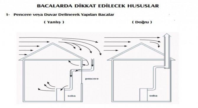Bacalar standartlara uygun ve yalıtımlı olmalı, düzenli olarak temizletilmeli, dumanın geri tepmesini önlemek için bacaların en üst noktasının çatının en üst noktasından 1 metre daha yüksekte olması sağlanmalı ve baca şapkası mutlaka takılmalı, binaların yangından korunması yönündeki mevzuat hükümlerine uyulmasına özen gösterilmelidir."