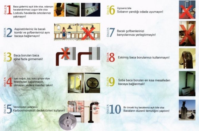 Gaz zehirlenmelerine karşı özellikle sobanın çok fazla doldurulmaması gerektiği belirtilen açıklamanın devamında şu ifadeler yer aldı: "Kullanılan her türlü ısıtma cihazının kalite belgesine sahip olup olmadığına, garantilerine ve garanti sürelerine dikkat edilmeli, kullanılan yakıtın standartlara uygunluğu kontrol edilmeli, izin belgesi olmayan satıcılardan kömür alınmamalı, aşırı doldurulan sobanın, duman yolu daralacağı, soba içinde düzensiz ısı dağılımı nedeniyle de baca çekişi zayıflayacağı için soba yakılırken aşırı doldurulmamasına dikkat edilmeli, sönmekte olan sobaya asla tutuşması güç yakıtlar konulmamalı, yakıt yavaş yavaş ilave edilmeli, yatmadan önce sobaya kesinlikle yakıt konulmamalı, iyi ısınmayan ve alttan yakılan kömür sobalarında karbonmonoksit zehirlenmesi riski artacağından soba tutuşturulurken yakıtın üstten yanması sağlanmalı, özellikle alçak basınçlı lodoslu havalarda ölüm olaylarında artış görüldüğü için eğer bacalar standartlara uygun değilse alçak basınçlı havalarda soba yakılmamalı, yakılması zorunlu ise gece yatarken mutlaka tam olarak söndürülmeli, soba borularının birbiriyle birleştirilmesinde hava ve baca gazı sızdırmazlığı sağlanmalı, sobanın bulunduğu yer sürekli havalandırılmalı,