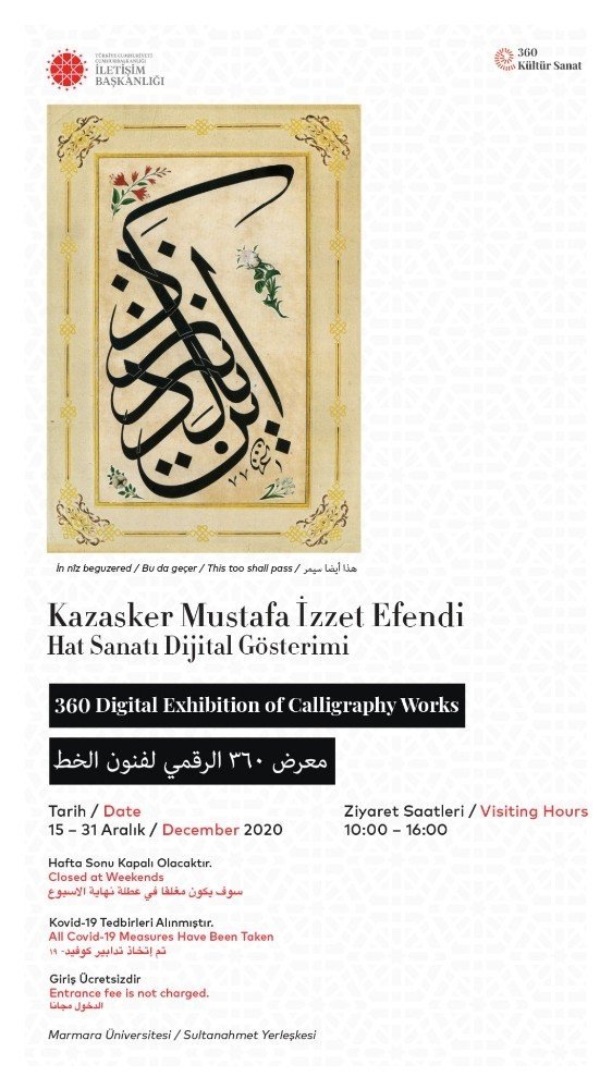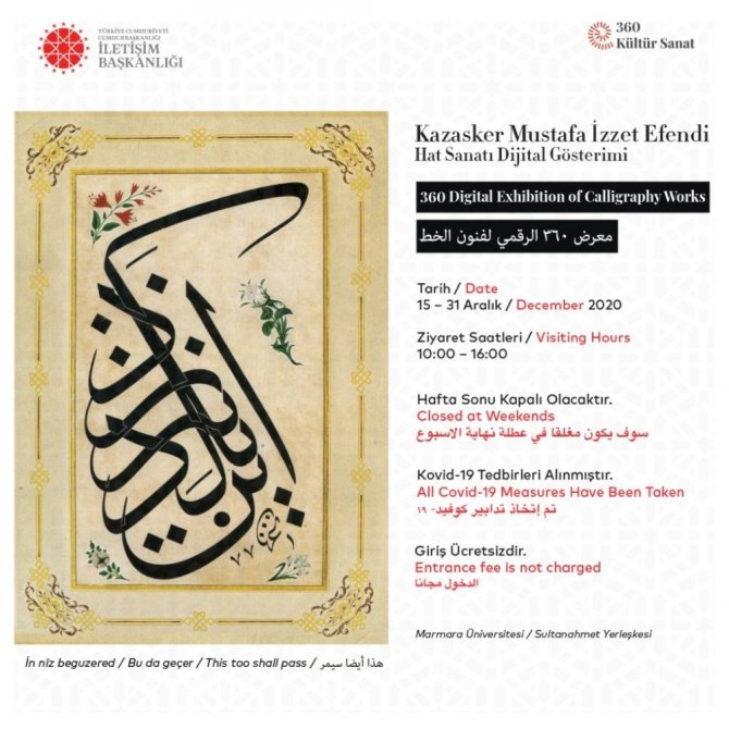 İletişim Başkanlığı, milli, tarihi, kültürel ve bilimsel zenginlikleri yeni iletişim araçlarını ve gösterim tekniklerini kullanarak vatandaşların erişimine sunmaya devam ediyor. Başkanlık, hologram ve özel projeksiyon teknolojisi ile dijital sergilerin gerçekleştirileceği yeni bir "360 Kültür Sanat" projesini daha hayata geçiriyor. Bu kapsamda Ayasofya Camii'ndeki 7,5 metre çapındaki devasa levhalardan Topkapı Sarayı Hazine Koğuşu Kitabesi'ne, Kahire Kavalalı Türbesi'ndeki İnsan Suresi'nden Washington Anıtı'ndaki mermer Osmanlı kitabesine kadar birçok mekânda izi bulunan ve eserleriyle hat sanatına özgün bir yorum getiren Kazasker Mustafa İzzet Efendi anısına hazırlanan hat eserleri dijital sergisi, 15 Aralık Salı günü Marmara Üniversitesi Sultanahmet Yerleşkesi'nde açılacak.