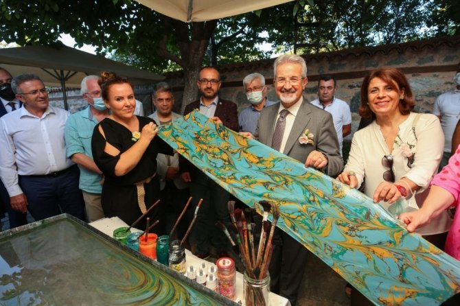 yrıca İpek Evi'nin bahçesinde iki ayrı atölye çalışması da yapıldı. Emine Elmas'ın ipek kumaş üzerine ebru sanatı uygulamasına ilişkin atölye ile Nadide Yakıt'ın gerçekleştirdiği ipek koza çiçek ve aksesuar yapımı atölyesi ilgi çekti. Atölye çalışmasını izleyen Başkan Erdem de ipek kumaş üzerine ebru yaptı. İki katlı mekânı gezen Başkan Erdem ayrıca, üst katta sergilenen dokuma tezgâhlarında da ipek dokuma denemesi yaptı.