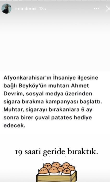 Afyonkarahisar'ın İhsaniye ilçesine bağlı Beyköy Mahallesi Muhtarlığı, geçtiğimiz Ocak ayında ödüllü bir sigara bırakma kampanyası başlatmıştı. Muhtar Ahmet Devrim tarafından başlatılan kampanya sonucunda sigarayı bırakanların başta patates olmak üzere çeşitli yöresel yiyecekler ile ödüllendirileceği duyurulmuştu. Ünlü şarkıcı İrem Derici de sosyal medya hesabından kampanyayı "19 saati geride bıraktık" notuyla paylaşmıştı. Kampanyaya katılan vatandaşların patateslerinin teslim edildiğini belirten Muhtar Ahmet Devrim, İrem Derici'yi de ödülünü almak üzere Beyköy'e davet etti.