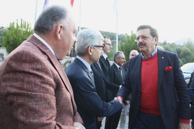 Manisa Ticaret ve Sanayi Odası ile Manisa Ticaret Borsasının davetlisi olarak Manisa’ya gelen TOBB Başkanı Rifat Hisarcıklıoğlu, Manisalı iş adamlarıyla buluştu. Hisarcıklıoğlu’nun Manisa programına, Aydın Ticaret Borsası Başkanı Hakan Ülken de eşlik etti. Bir otelin toplantı salonunda gerçekleştirilen ‘Manisa İş Dünyası Müşterek İstişare’ toplantısına Manisalı iş adamları yoğun ilgi gösterdi. Toplantının açılış konuşmasını yapan Manisa Ticaret Borsası Başkanı Sadık Özkasap, Manisa’nın tarımsal ihracatıyla ilgili önemli açıklamalar yaptı. Özkasap, "4 milyar 450 milyon dolarlık toplam ihracatıyla Manisa, Türkiye sıralamasındaki yerini korudu. Bugün yine yüzde 15’lik kısmı cari açığın kapatılmasında en etkin katkıyı sağlayan tarım ve tarıma dayalı sanayi oluşturdu. 5 borsamızda kayda geçen tarıma dayalı iç ticaret hacmimiz geçen yıl yine Manisa’da gerçekleşen bölgesel istişare toplantısında Ticaret Bakanımız Ruhsar Pekcan’a da söz verdiğimiz gibi 10 milyar Türk Lirası seviyesini geçti. Manisa Sultaniye Çekirdeksiz Üzümü’nün lokomotif olduğu ülkemizin çekirdeksiz kuru üzüm ihracatı 510 milyon doları geçti. Yaş üzüm ihracatı ile birlikte sadece bu üründen Manisamızın ülkesine katkısı 1 milyar dolara yaklaştı. Pamuk üretimine verilen desteklere de bağlı olarak Manisalı üreticilerimiz pamuk üretimine yeniden başlamak için ayırdıkları tarım alanlarını arttırmayı sürdürdüler. Ancak ülkemizin ihtiyaç duyduğu pamuğun önemli bir miktarı halen ithal ediliyor olması nedeniyle açık verdiği bu üründe pirime koşul olarak belirlenen münavebeli üretim süresini, piyasa dengesi ve üretim istikrarı için 2 yıldan 4 yıla uzatılması ve primin arttırılması yönündeki taleplerimiz devam ediyor” dedi.