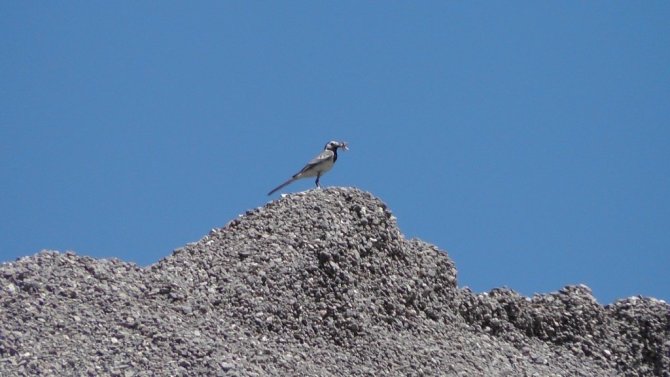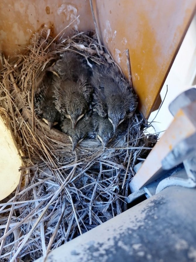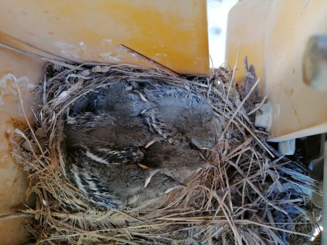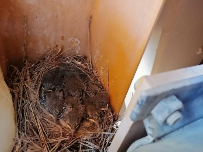 Erzurum'un Oltu ilçesindeki beton santralinde kepçe operatörü olarak çalışan Remzi Öztürk tarafından kullanılan kepçenin hidrolik tankının üzerinde kuyruk sallayan kuşu üç yıldır yuvasını kepçe içerisine yaparak beş yavrusunu kepçe içerisinde büyütüyor.