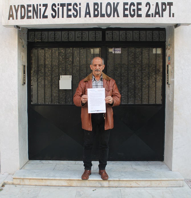 Yüklenici firmanın işi tamamlamaması nedeniyle mağdur olduklarını belirten Aydeniz Yapı Kooperatifi Ege Apartmanı A Blok yöneticisi Fikret Yılmaz, kendisi ile birlikte apartmanda yaşayan 20 ailenin mağdur olduğunu söyledi. Yılmaz, “Apartmanımızın yenileme çalışması için Mevlana İnşaat firmasıyla sözleşme imzaladık. Sözleşme gereği parasını peşin ödedik ancak ilgili firma anlaşmaya uymadı. Standartlara uygun malzeme kullanmadığı gibi işi yarım bırakıp gitti. Boya-badana, apartman çevre duvarlarının tadilat işleri yapılmadı. İşi yarım bıraktığı için inşaat molozları dışarıda kaldı. Belediye molozları temizlememiz aksi halde 16 bin lira ceza uygulanacağı konusunda uyarıda bulundu. Firmanın yapması gereken temizliği biz yaptık” dedi.