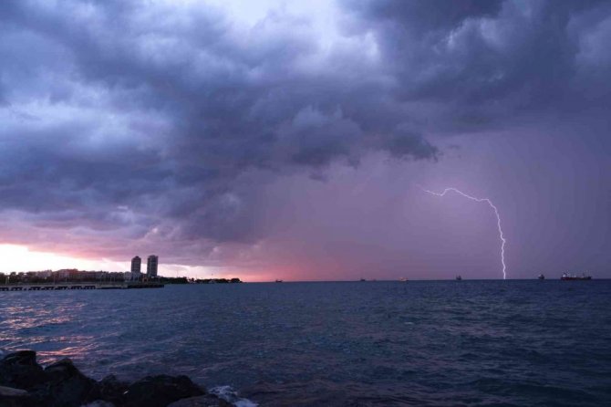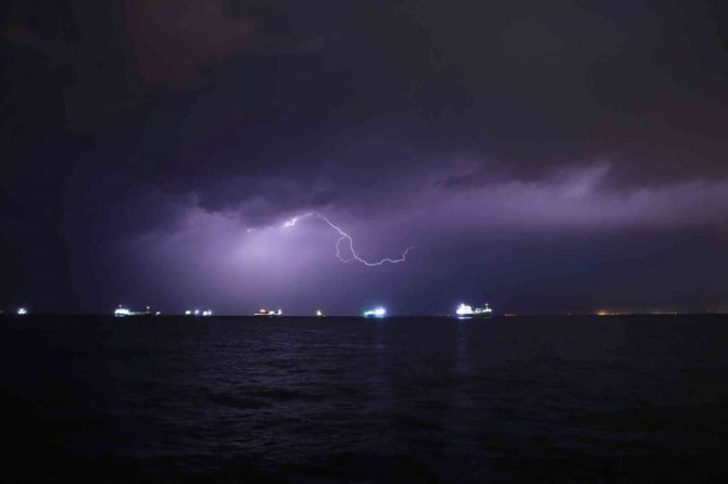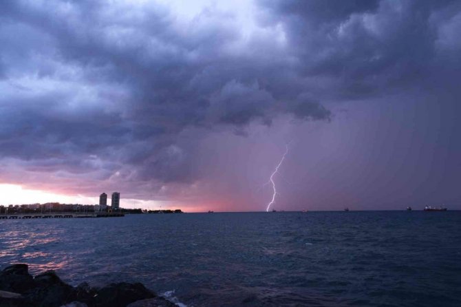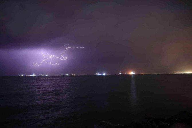 Hatay'da gün batımında İskenderun Körfezi üzerinde çakan şimşekler adeta görsel bir şölen oluşturdu.