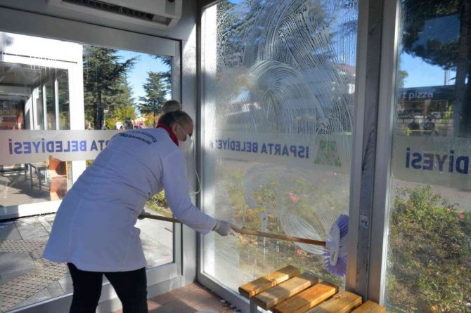 Isparta’da otobüs durakları sabunlu suyla temizleniyor