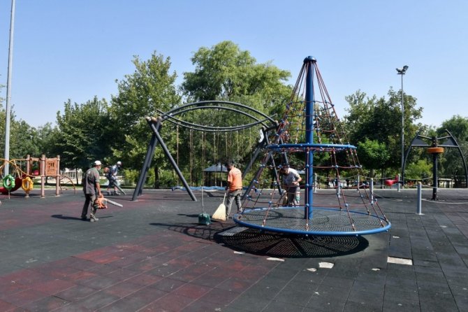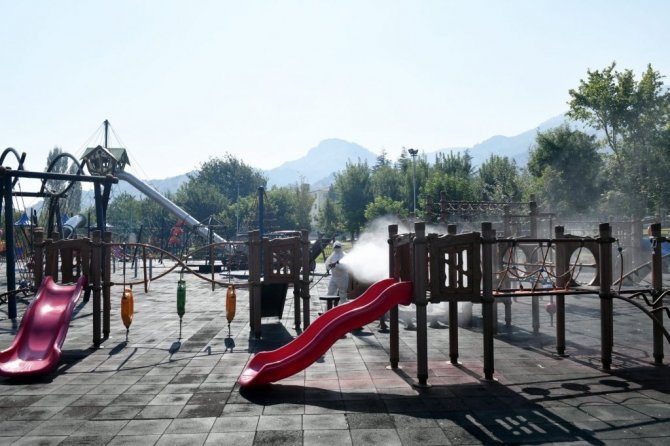 Temizlik İşleri Müdürlüğü ekipleri çalışmaları kapsamında çocuk oyun alanları temizleniyor, ardından da oyun ve spor aletleri en ince ayrıntısına kadar dezenfeksiyon işleminden geçiriliyor.