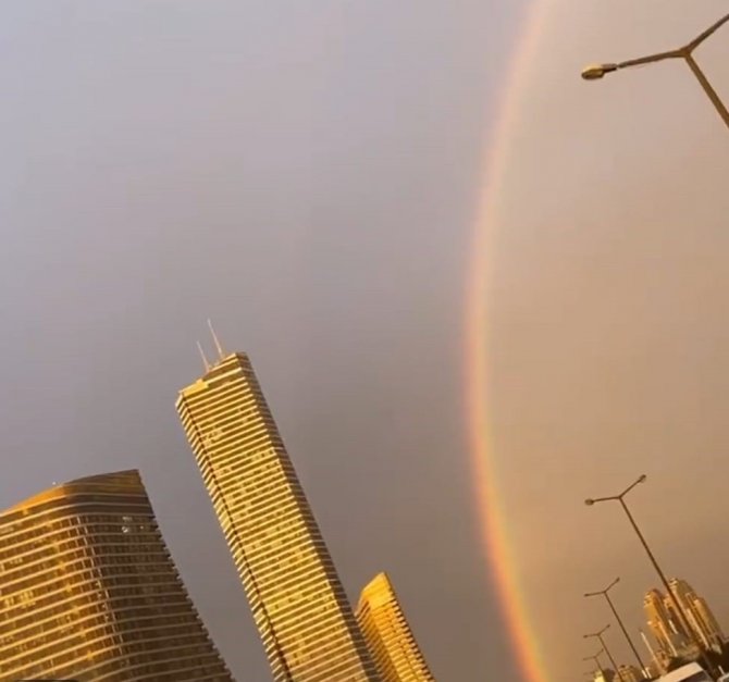 İstanbul'da dün öğle saatlerinden itibaren etkisini sürdüren şiddetli fırtına ve yağış etkisini sürdürmeye devam ediyor. Vatandaşların yolda yürümekte dahi zorluk çektiği şiddetli rüzgar ve yağışla birlikte kısa süreliğine gökkuşağı ortaya çıktı. Şehrin birçok noktasından da görünen gökkuşağı güzel görüntüler oluşturdu. Vatandaşlar yaşanan renkli anları cep telefonu ile kayda aldı.
