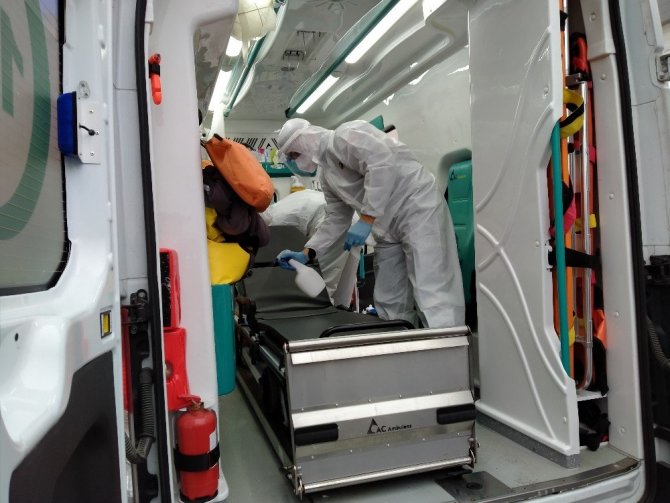 Covid-19 nöbetindeki 112 Acil Servis ekipleri, kendilerine ihbar geldiği anda hemen özel kıyafetlerini giyip yola çıkıyor. Hastayı ambulansa alan ekipler hızlı bir şekilde sağlık kuruluşuna vardıktan sonra ambulansı baştan aşağı dezenfekte ediyor.