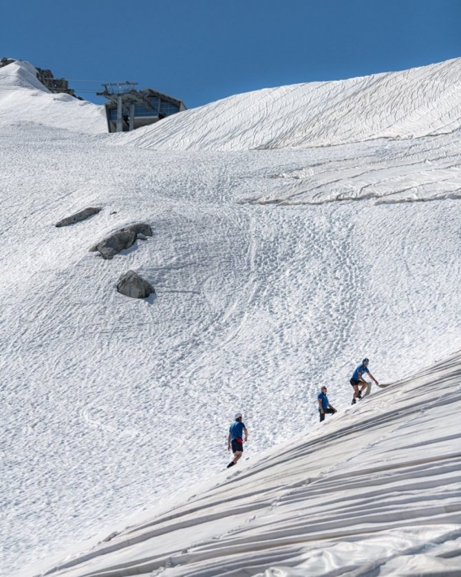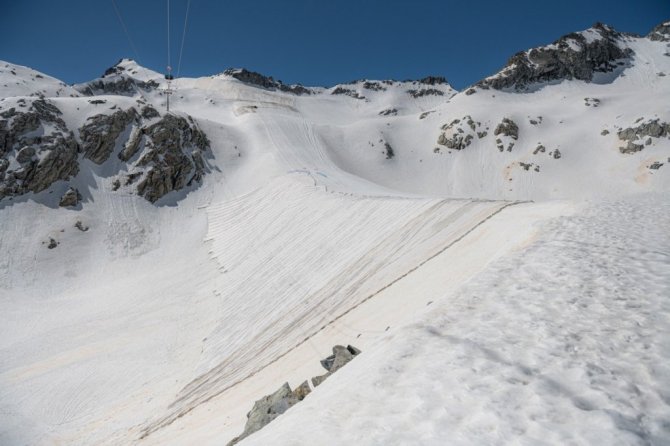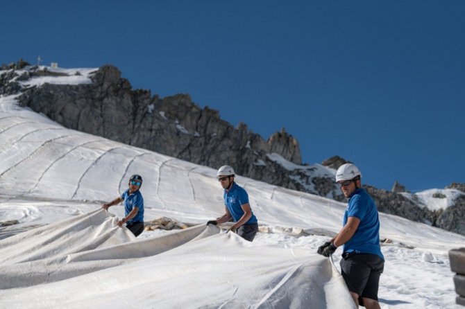 İtalya'daki Presena buzulu bu yıl da küresel ısınmaya karşı jeotekstil brandalardan yapılan muşambalarla kaplandı.