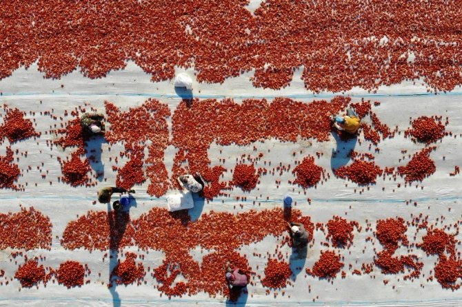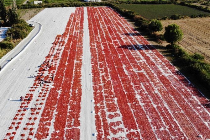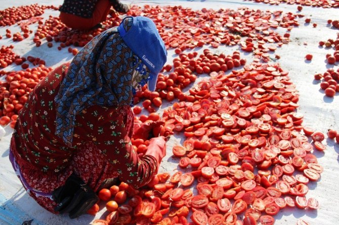 Tarlalarında domates kurutma işi yapan Hatice Başak ise, her yıl çiftçilerden aldıkları domatesleri güneşin altında tuzlayıp yaklaşık 1 hafta boyunca güneş altında beklettiklerini söyleyerek, “Kuruduktan sonra fabrikalarda işleniyor. 14 kilo taze domatesten 1 kilo kuru domates elde ediyoruz. Bu kuru domatesleri İtalyanlara pizza malzemesi olarak gönderiyoruz. Bu ürünlerin yurt dışında çok sevilmesi bizleri gururlandırıyor” ifadelerini kullandı.