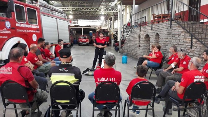 Muğla 911 Arama Kurtarma ve Araştırma Derneği gönüllüleri, itfaiye görevlilerinden yangın söndürme eğitimi aldı.