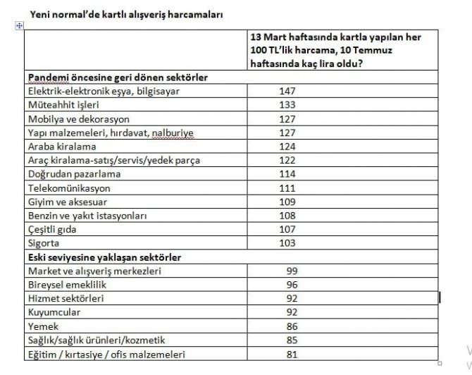 Öte yandan market ve alışveriş merkezleri, bireysel emeklilik, hizmet sektörleri, kuyumcular, yemek, sağlık-sağlık ürünleri-kozmetik, eğitim-kırtasiye-ofis malzemeleri harcamaları da pandemi öncesi seviyesine hızla yaklaşıyor.