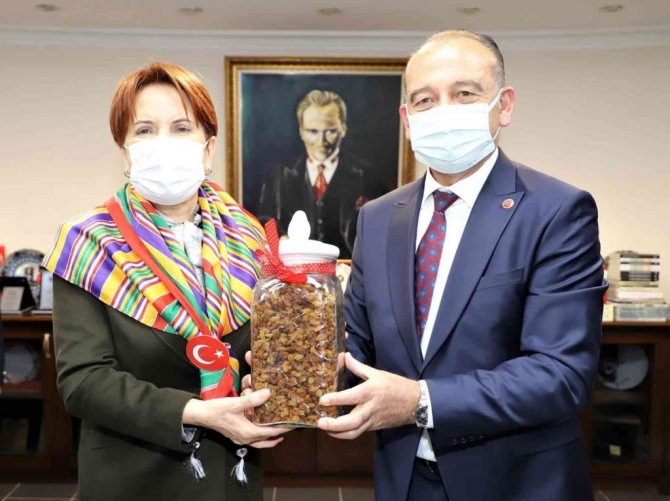 Başkan Çetin Akın, görüşmenin sonunda "Üzümün başkenti Turgutlu'dan en güzel hediye" sözleriyle kuru üzüm ve çeşitli hediyeleri Genel Başkan Akşener'e takdim etti.