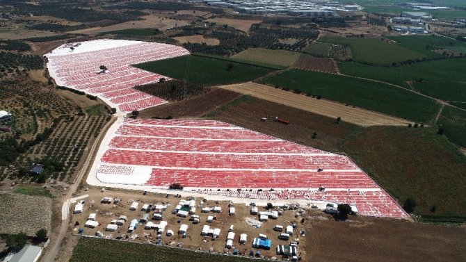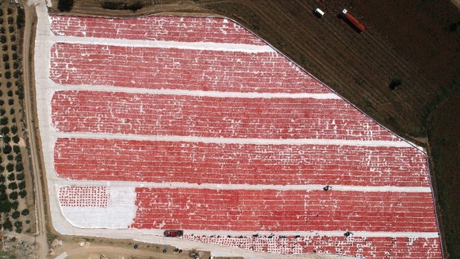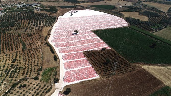 İzmir’in Torbalı Ovasında domates hasadının başlamasının ardından kurutmak için ayrılan domatesler tarlalara serilmeye başlandı. Serilen domatesler, Torbalı Ovasını adeta kırmızıya boyadı.
