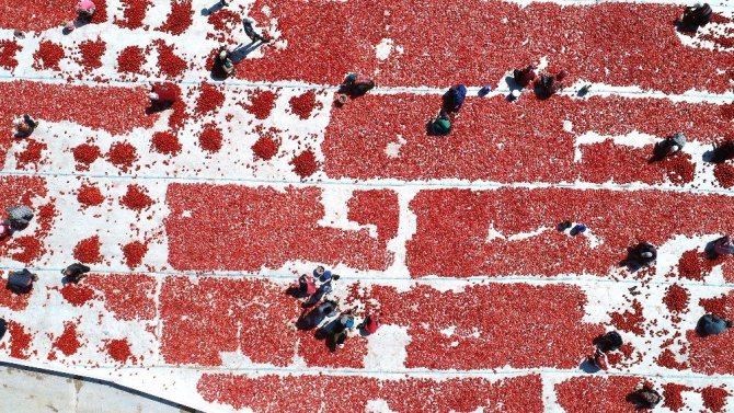 İzmir’in Torbalı ilçesinde kurutulmak üzere tarlalara serilen domatesler ovaları kırmızıya bürüdü. Kurutulan domatesler, Avrupa ve Amerika’ya kilosu 4 eurodan ihraç ediliyor.