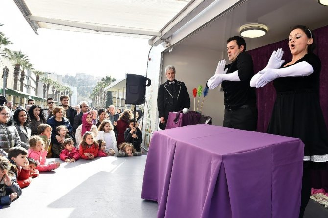 İzmir Büyükşehir Belediyesi ayrıca, bir kamyon üzerinde kurduğu “Gezici Sanat Sahnesi” ile kentin meydanlarını da renklendiriyor. 5 Mart’ta 17.00’da Bornova Meydanında, 6 Mart’ta saat 17.00’de Bayraklı Sevgi Yolunda, 7 Mart’ta 17.00’de Çiğli Kasaplar Meydanında, 8 Mart’ta yine saat 17.00’de Göztepe Denizatı Heykeli önünde, 9 Mart’ta ise aynı saatte Bornova Küçük Park’ta Bulgaristan’dan gelen sanatçılar “Sihir ve Ötesi” isimli gösteriyle İzmirlilere keyifli anlar yaşatacak.