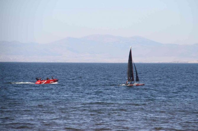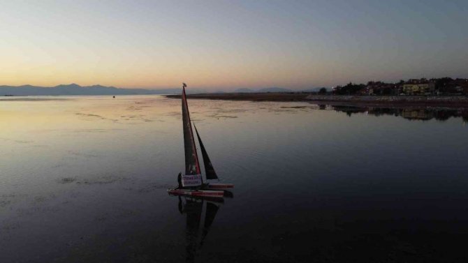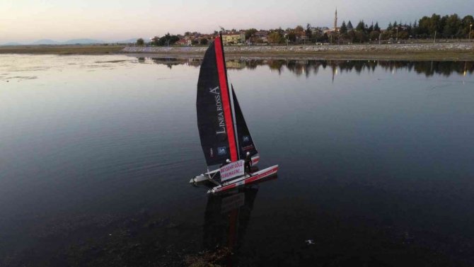 Türkiye'nin en büyük tatlı su gölüne açılan yelken sporunun profesyonel isimleri, yelkenli katamaran üzerinde "Beyşehir Gölü kurumasın" yazılı pankart...