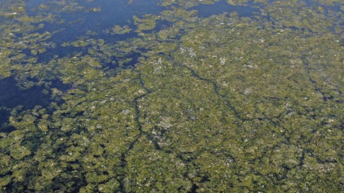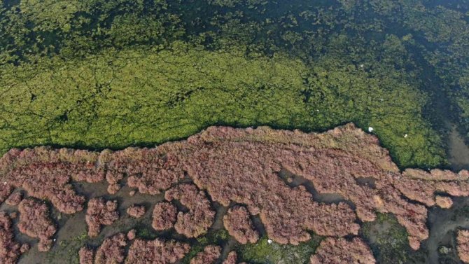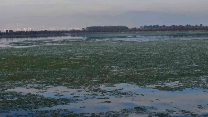 İzmir İnciraltı mevkiindeki Çakalburnu Lagünü'nde görülen deniz marullarının alanı genişlerken, suyun yüzeyi adeta yeşil örtüyle kaplandı.
