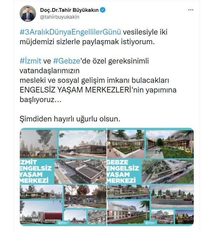 Kocaeli Büyükşehir Belediye Başkanı Tahir Büyükakın, sosyal medya hesabından İzmit ve Gebze'ye yeni birer engelsiz yaşam merkezi kuracaklarını duyurdu. Büyükşehir, özel gereksinimli vatandaşlar için kuracağı merkezde hidroterapi havuzları ve gündüz bakım birimleri, özel eğitim sınıfları, beceri geliştirme ve meslek edinme atölyeleri, spor ve aktivite salonları, kültürel ve sanatsal gelişim akademileri, kütüphaneler, dinlenme ve sosyal alanlar bulunacak. Merkezde ayrıca zihinsel engelli, down sendromlu, otizm tanılı, bedensel engelli, işitme engelli, görme engelli, süreğen engel gruplarındaki tüm vatandaşlar için uzman personel eşliğinde sosyal gelişim imkanları sunulacak.