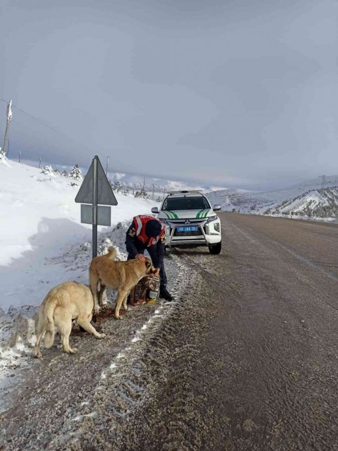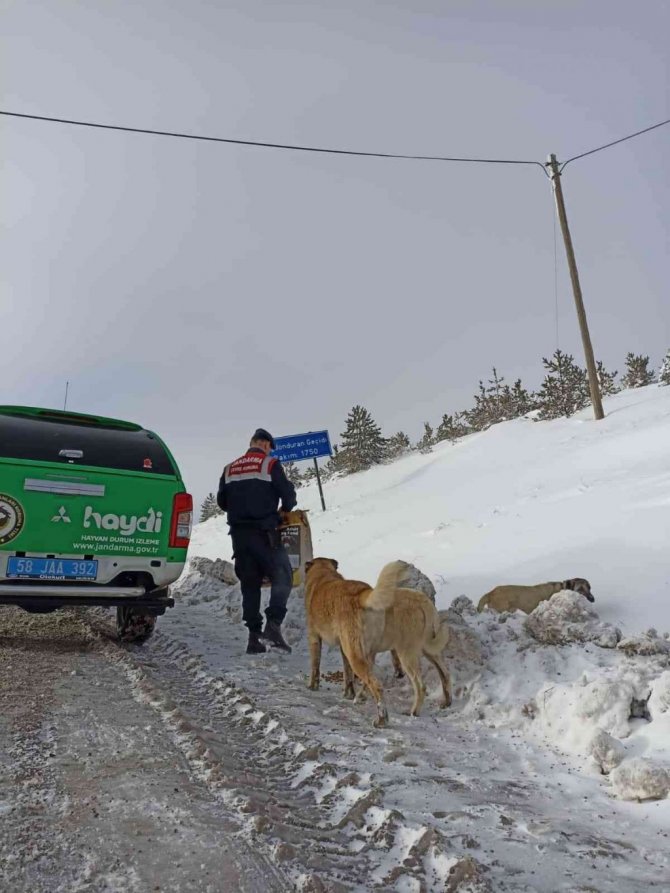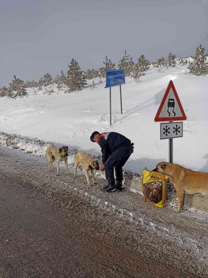 Sivas İl Jandarma Komutanlığı yürekleri ısıtan bir çalışmaya imza attı. İl Jandarma Komutanlığı bünyesinde bulunan Çevre Doğa ve Hayvanları Koruma Tim Komutanlığı ekipleri, Kangal ilçesi Yağdonduran mevkiinde kar ve soğuktan etkilenen köpekler için doğaya mama bıraktı. Ekipler, mamaları çeşitli noktalara bırakarak köpeklerin beslenmesini sağladı.