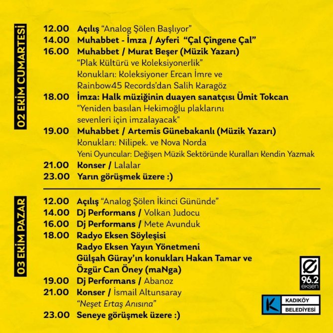 Kadıköy Plak Günleri ikinci gününde de açılışını analog müzik şöleniyle yapacak. Gün boyu, plak koleksiyoneri Volkan Judocu; radyocu, müzik eleştirmeni, koleksiyoner Mete Avunduk ve koleksiyoner Abanoz'un dj performansıyla plaklardan müzik sesleri yükselecek. Programın ikinci gün söyleşisinin konuğu Hakan Tamar ve Özgür Can Öney (Manga) olacak. Radyo Eksen Yayın Yönetmeni Gülşah Güray'ın moderatörlüğünü yapacağı söyleşi 18.00'de başlayacak. Kadıköy Plak Günleri saat 21.00'de gerçekleşecek konserle kapanışını yapacak. Konser, 2012 yılında aramızdan ayrılan Türk Halk Müziği'nin değerli ismi Neşet Ertaş anısına yapılacak. "Bozkırın Tezenesi" adına yapılan konserde, Türk Halk Müziği sanatçısı İsmail Altunsaray, usta sanatçı Neşet Ertaş'ın türkülerinden oluşan birbirinden değerleri eserleri seslendirecek.