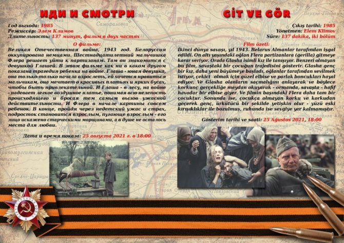 Mosfilm'in seçkisi en iyi savaş filmleri Türkçe altyazılı olarak gösterilecek ve ücretsiz biletler CKM'nin internet sayfasından indirilebilecek. Rus Filmleri haftasında; Bir İnsan Kaderi, Git ve Gör, Leylekler Uçuyor, Yıldız, Bir Asker Destanı, Beyaz Kaplan, Vatan İçin Savaştılar adlı filmler sinemaseverlerle buluşacak. Büyük Vatan Harbi anısına CKM Galeri'de düzenlenen fotoğraf sergisi de 29 Ağustos'a kadar ziyaret edilebilir.