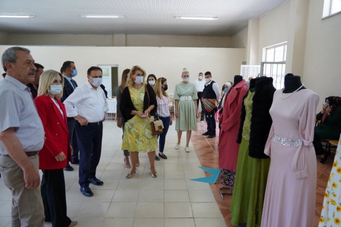 Başkan Semih Şahin ve eşi Serpil Şahin, Belediye Başkan Yardımcıları Melek Mızrak Subaşı ve Ahmet Gürses, il genel ve belediye meclis üyeleri, muhtarlar ve birim müdürleri eşliğinde Aşağıköy dikiş kursunda faaliyet gösteren kadınlarının yaptığı ele emeği göz nuru ürünlerin sergilendiği sergiyi ziyaret etti.