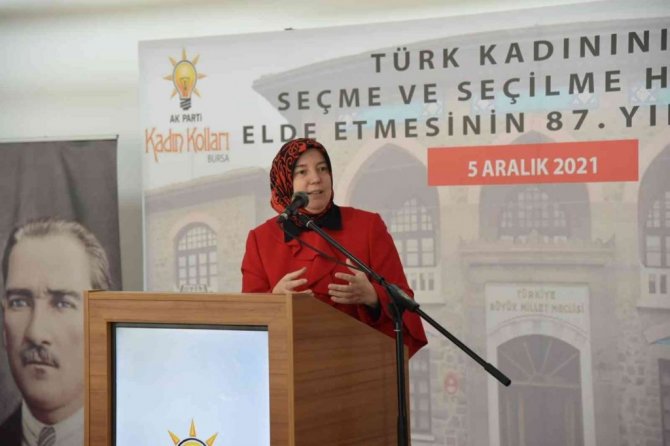 AK Parti Bursa İl Kadın Kolları Başkanı Emel Gözükara Durmaz, Türkiye'de kadınlara seçme ve seçilme hakkının birçok ülkeden önce tanınarak, hayata geçirildiğini vurguladı. Kadınlara seçme ve seçilme hakkının 1934 yılında verildiğini ancak bu hakların bütün kadınlarımız tarafından kullanılmasının yolunun 1 Ekim 2013 tarihinde AK Parti hükümetlerince açıldığını hatırlatan Durmaz, "2013 yılı Ekim ayında demokratikleşme paketi kapsamında kamuda başörtüsü serbest bırakılmıştır. Yapılan düzenlemeyle kadını toplumdan ve kamu kurumlarından tecrit eden yasakçı zihniyet tarihin karanlık sayfalarına gömülmüştür. 31 Mart 2019 yerel seçimlerinde, AK Parti listelerinde büyükşehir, ilçe belediye ve il genel meclis üyelikleri için 2016 kadın aday meclis üyesi, asil aday listelerinde yer almış, Bunlardan bin 4'ü meclis üyesi olmaya hak kazanmış, bin 88'i kadın da muhtar seçilmiştir. Şu anda 7 ilçe ve 1 büyükşehir olmak üzere toplam 10 kadın belediye başkanımız görev yapmaktadır" dedi.