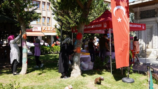 Keçiören Belediyesi tarafından ağaç sevgisine ve kadına yönelik şiddete dikkat çekmek için hayata geçirilen "Parka Hanımeli Değdi" projesi ile Keçiörenli kadınlar ilçedeki ağaçları tığ işlemeli rengarenk motiflerle süsledi.