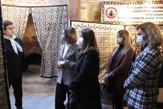 İlk Türk Kadın Mitinginin 102. yılı dönümü dolayısıyla kadınların elinden çıkan birçok eseri sergilediklerini söyleyen Şahin, "Seydiler'de 1877-1966 yılları arasında yaşamış Seydiler'in Çırdak köyünden Nefise Akpınar'ın bizler taş baskı kalıplarını bulduk. Bizler bu taş baskı kalıplarının bakımını yaptırdık. Veliye Martı adında araştırmacı-yazar ve tasarımcı bir arkadaşımız bu kalıpların bakımlarını yaptı. Şu anda burada görülen eserlerin baskıları 120 yıl öncesine dayanan taş baskı kalıplarıyla yapıldı. Hepsinden bir tane yaptık. Bunları daha öncesinde Seydiler'de sergilemiştik, bu özel günde de sergileyelim istedik. İnşallah sergimizi ziyarete gelenler tasarımlarımızı beğenmişlerdir" diye konuştu.