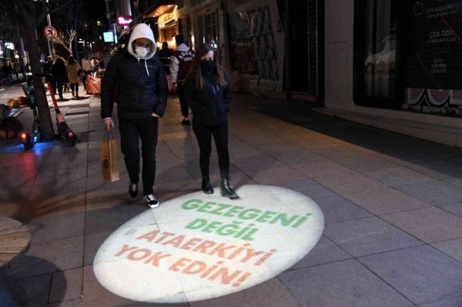 Yere projeksiyon cihazı ile yansıtılan yazılar arasında, "Erkek şiddetini yıkıp yerine brokoli ekeceğiz", "Saçımı süpürge etmiyorum, süpürgeme binip uçuyorum", "Ne giydiğim zevk meseledir, ahlak meselesi değil", "Kadınlar birlikte güçlü", "Geceleri de sokakları da meydanları da terk etmiyoruz", "6284'ü uygula! faili koruma!" "Kadın istihdamı sosyal sorumluluk projesi değil, haktır!", "Kadın kadının yurdudur, kadın dayanışması yaşatır!", "Ne şan şöhretiniz ne de takım elbiseniz. Suçunuzu hafifletmez. imza:gerçek adalet!", "Beyaz atlı prens boşuna gelme", "Kırmızı ruj politiktir!" gibi ifadeler yer aldı.