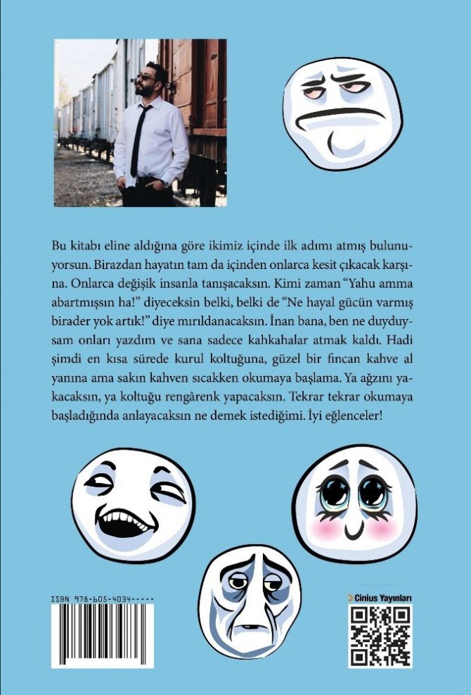 “Bu kitabı eline aldığına göre ikimiz için de ilk adımı atmış bulunuyorsun. Birazdan hayatın tam da içinden onlarca kesit çıkacak karşına. Onlarca değişik insanla tanışacaksın. Kimi zaman Yahu amma abartmışsın ha! diyeceksin belki, belki de ne hayal gücün varmış birader, yok artık! diye mırıldanacaksın. İnan bana, ben ne duyduysam onları yazdım ve sana sadece kahkahalar atmak kaldı. Hadi şimdi en kısa sürede kurul koltuğuna, güzel bir fincan kahve al yanına ama sakın kahven sıcakken okumaya başlama. Ya ağzını yakacaksın, ya koltuğu rengârenk yapacaksın. Tekrar tekrar okumaya başladığında anlayacaksın ne demek istediğimi. İyi eğlenceler!”