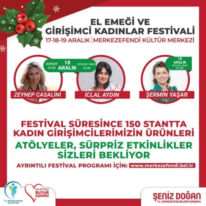Merkezefendi Belediyesince düzenlenecek olan El Emeği ve Girişimci Kadınlar Festivali'nde girişimin kadın kahramanları bir araya gelecek. 17 Aralık Cuma günü başlayacak olan festival, 18 Aralık Cumartesi ve 19 Aralık Pazar günlerinde de devam edecek. Merkezefendi Kültür Merkezi'nde gerçekleştirilecek festivalin ilk gününde Zuhal Feray Şenkibar ile Merkezefendi Belediye Orkestrası konser verecek. Festivalin ikinci gününde ünlü yazar İclal Aydın saat 15.00'te söyleşi ve imza etkinliği düzenleyecek. Saat 20.00'de Zeynep Casalini, Zuhal Feray Şenkibar ve Rollback grubu ile birlikte konser verecek. El Emeği ve Girişimci Kadınlar Festivali'nin son gününde ise yazar Şermin Yaşar saat 14.00'te söyleşi ve imza etkinliğinde okuyucuları ile buluşacak. Festival boyunca 150 stantta kadın girişimcilerin ürünleri, atölyeler ve sürpriz etkinlikler yer alacak.