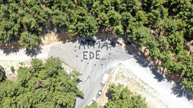 Ormanlık bölgede düzenlenen etkinlik sonrası çöp torbalarıyla "Atma Ede" yazması renkli görüntüler oluşturdu.