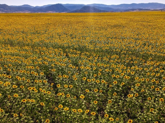 Kahramanmaraş'ta sarı renkte açan ayçiçeği tarlaları görsel şölen oluşurdu.