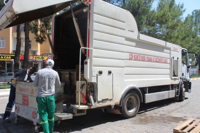Kahta’daki çöp konteynerleri parfümlü dezenfektanla yıkanıyor