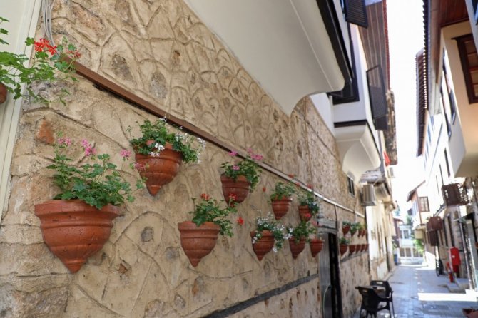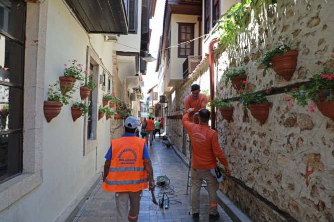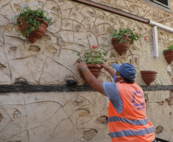 Antalya Büyükşehir Belediyesi, Park ve Bahçeler Dairesi Başkanlığı ekipleri tüm Kaleiçi sokaklarını sardunya çiçeğiyle donatıyor.